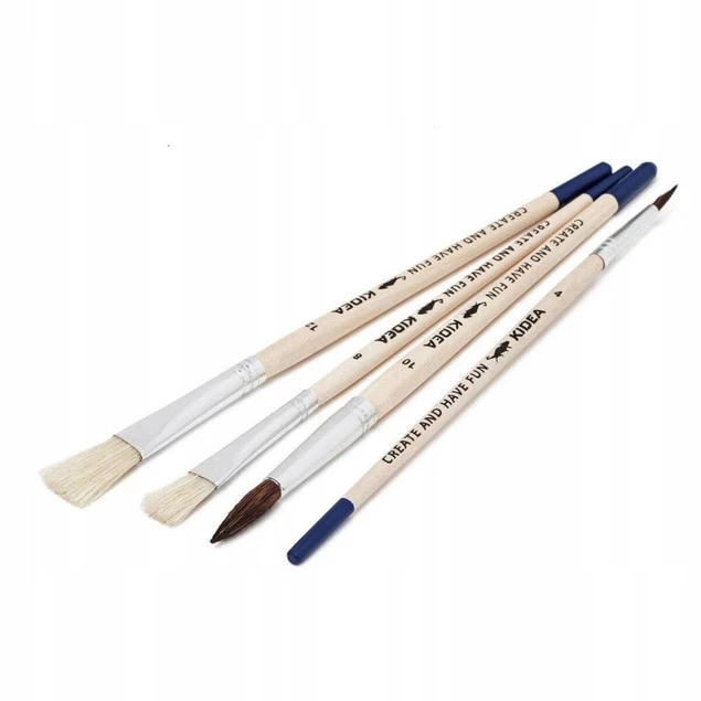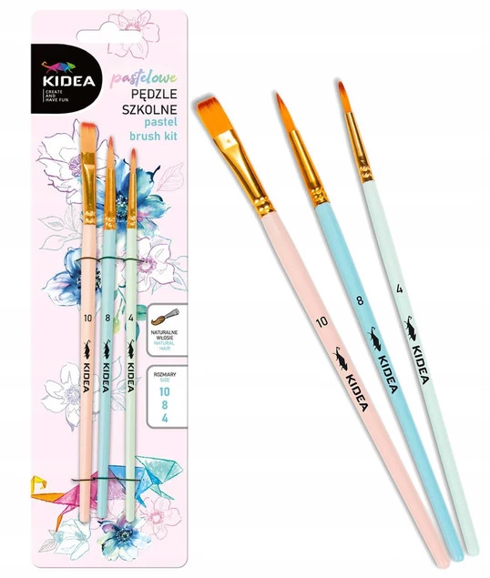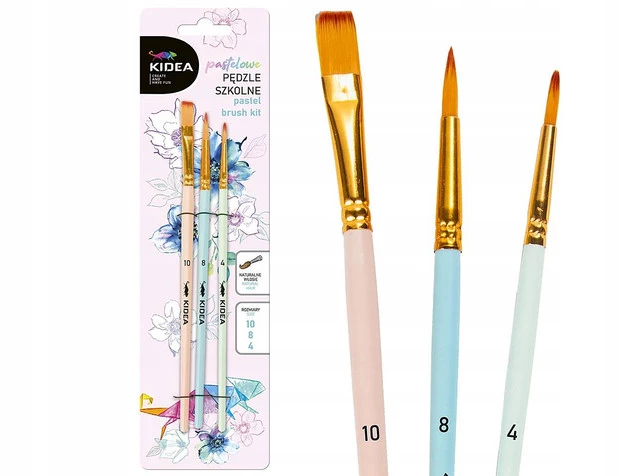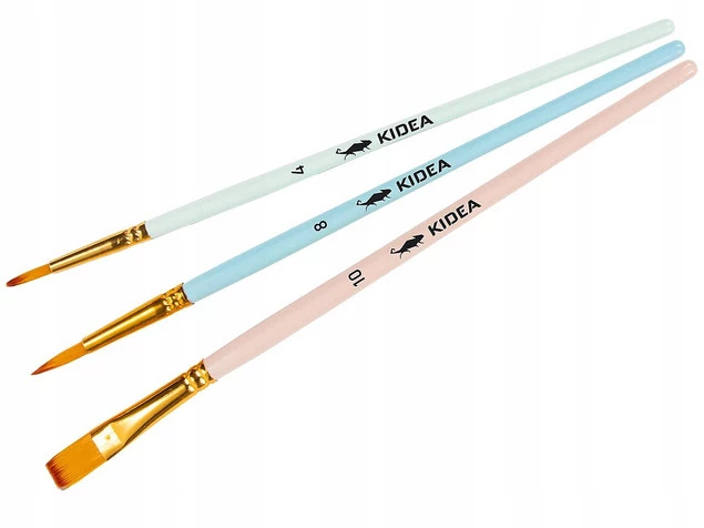 Pędzle do malowania Kidea z końcówką z naturalnym włosiem w 3 rozmiarach: 10, 8 i 4. Końcówki o różnych wielkościach i kształtach idealnie sprawdzą się podczas malowania detali, tła, czy mieszania kolorów na płótnie.