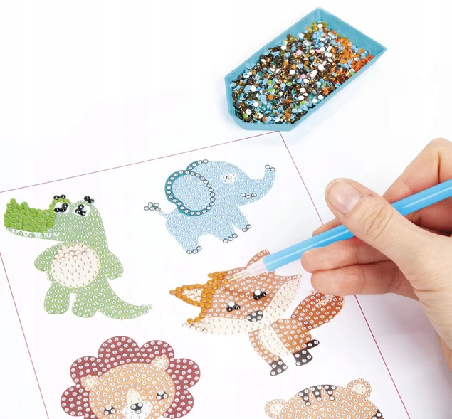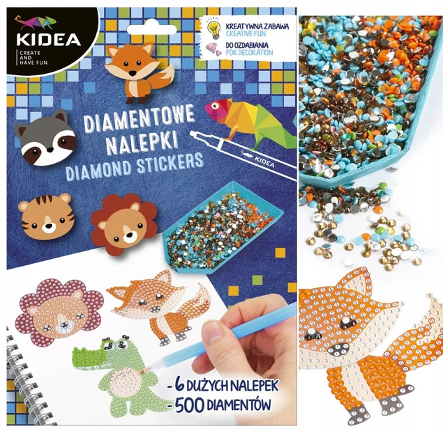 Diamentowe nalepki dla dzieci od Kidea. Zestaw zawiera 6 nalepek z uroczymi zwierzakami: krokodylem, słoniem, lwem, liskiem, szopem i tygrysem, 500 diamentów w 9 różnych kolorach, aplikator, tackę na diamenty oraz wosk. Haft diamentowy to twórczy sposób spędzania wolnego czasu, który zyskuje coraz więcej popularności. Tworzenie trójwymiarowych mozaik pozwala się zrelaksować, uspokoić emocje oraz rozwija kreatywność i wyobraźnię. Co więcej, po ułożeniu diamencików na nalepce, można ozdobić nią zeszyty, książki, kubki, czy meble. Zestaw to wciągająca zabawa, która sprawdzi się również jako prezent!
