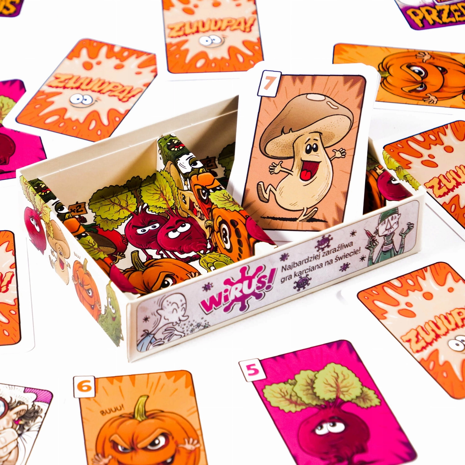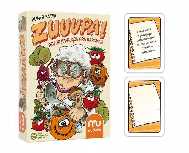 Barszcz, grzybowa, a może pomidorowa? Co przygotujesz z rosołowych resztek i dostępnych składników? Zostań najsprytniejszym kucharzem w restauracji i udowodnij rywalom, że to właśnie Ty przyrządzasz najpyszniejsze zupy. Imprezowa gra, w której każdy zagrywa przed siebie karty do momentu osiągnięcia na stole wymaganej liczby warzyw. Niewykorzystane do przepisu składniki przepadają, a wygrywa gracz, który zdobędzie najwięcej punktów za ugotowane warzywa. Dynamiczna rozgrywka dla 2-5 graczy od ósmego roku życia trwająca ok. 20 minut. Must have dla fanów Wirusa!. Zuuupa będzie doskonałym prezentem dla graczy uwielbiających blef i lekką, negatywną interakcję.
