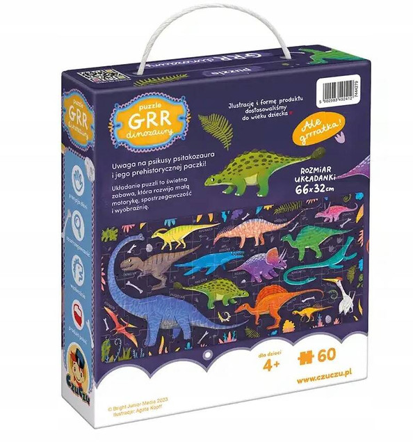 Puzzle Grr Dinozaury składają się z 60 elementów – to doskonała układanka dla przedszkolaków, szczególnie jeśli interesują się prehistorycznymi gadami. To świetny start, aby odkryć tę fascynującą dziedzinę i łączyć dobrą zabawę ze zdobywaniem nowej wiedzy. Wszak to właśnie zabawa jest dla dzieci naturalnym polem do eksperymentowania i odkrywania świata. Sympatyczne dinozaury inspirują do wielu rozwijających aktywności i odkrywania pasji.