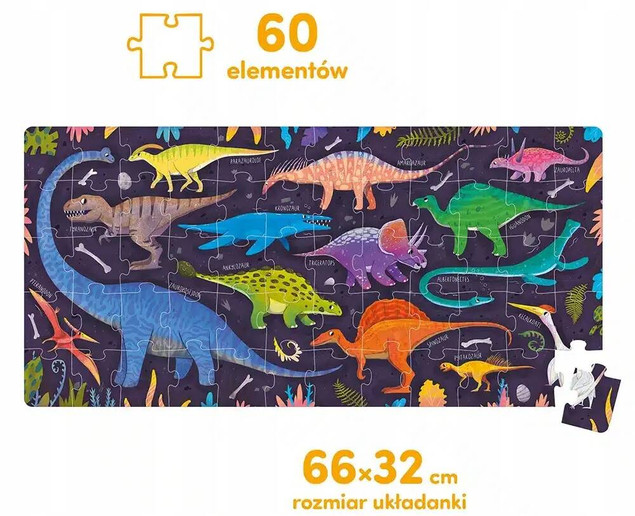 Duża i kolorowa układanka składa się z 60 elementów. Przedstawia 14 dinozaurów i innych prehistorycznych gadów gotowych na haRRRce! Puzzle to RRewelacyjny pomysł na prezent dla przedszkolaka, szczególnie jeśli inteRResuje się paleontologią. Układanie puzzli to baRRdzo rozwijająca zabawa. Kogo do niej zapRRRosicie?