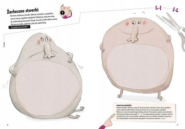 Na 64 stronach zebrano wiele wesołych ćwiczeń, podzielonych według wieku dziecka i stopnia trudności. Dotyczą one głosek, które w rozwoju wymowy sprawiają najwięcej kłopotu (m.in.: k, g, l, ś, ź, ć, dź, s, z, c, dz, sz, ż, cz, dż, r). Wykonując zawarte na kartach książki zadania, dzieci pracują nad poprawną artykulacją, a rodzice mają okazję do wspólnej zabawy, dzięki której dowiedzą się, czy rozwój wymowy malucha przebiega poprawnie, czy może należy zasięgnąć porady logopedy. Proponowane zadania zachęcają również do ćwiczenia sprawności grafomotorycznej i słuchu fonemowego oraz rozwijania wyobraźni twórczej dzieci.