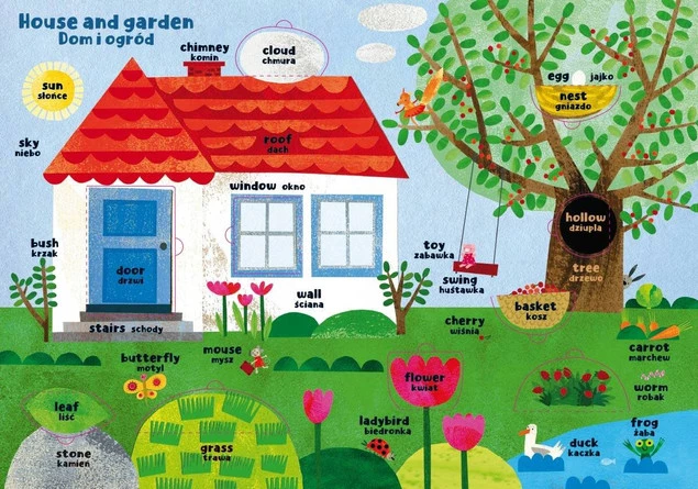 W pierwszej części „W domu" pojawia się słownictwo związane z domem i rodziną, nazwy domowych pomieszczeń i sprzętów, zabawek i ubrań, członków rodziny, części ciała i wielu drobiazgów – w sumie ponad 200 słówek. Na każdej rozkładówce można odszukać i otworzyć okienka (w całej książce jest ich ponad 50), co pozwala odkrywać kolejne szczegóły i słowa.
