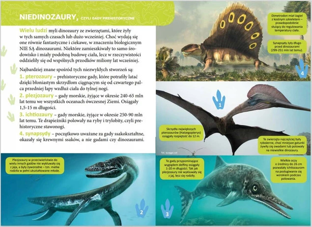 W tej książeczce przyjrzymy się dinozaurom. Czy w epoce tych prastarych zwierząt żyły też inne stworzenia? Czym zajmuje się paleontolog i co to takiego paleobotanika? Czy tyranozaur mógł mieć pióra? Do czego triceratopsowi służyła kryza? Co jadał brachiozaur? Kto miał „kaczy dziób” i na czym polega jego wyjątkowość? Znajdziesz tu odpowiedzi na te i wiele, wiele innych pytań. Nie zwlekaj i ruszaj w odkrywczą podróż!