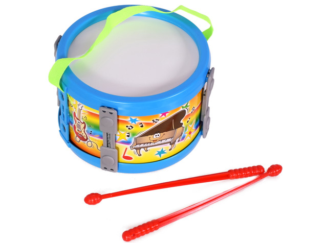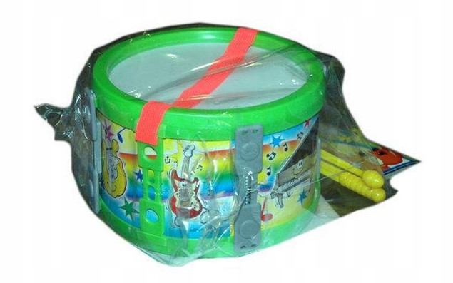 Zestaw składa się z bębenka i dwóch pałeczek do grania. Dodatkowo bębenek posiada pasek, dzięki któremu młody muzyk zawiesi sobie bębenek na szyi i wyruszy w swój świat wyobraźni bez obaw, że zgubi zabawkę :)