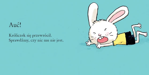 Ojej, króliczek upadł. Czy nic mu nie jest? O nie! Krew! Skaleczył się. Trzeba podmuchać, nakleić plasterek, otrzeć króliczkowi łzy. Nie płacz, króliczku. Do wesela się zagoi. Uszy do góry!