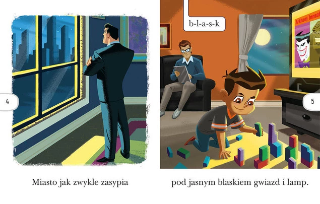 Książka dla dzieci, które lubią filmy animowane. Zapada wieczór. Nieustraszony strażnik Gotham City wyrusza na akcję. Będzie chronić mieszkańców miasta przed złoczyńcami. W tym czasie mały chłopiec w pelerynie musi zadbać o porządek w pokoju i bezpieczeństwo towarzyszy swoich codziennych zabaw. Każda z czynności, które wieczorem wykonuje malec, nawiązuje do odważnych działań mrocznego rycerza. W końcu zmęczony chłopiec zasypia, tuląc figurkę swojego idola. Świetna propozycja dla wszystkich fanek i fanów Batmana. Bo każde dziecko może być superbohaterem albo superbohaterką!