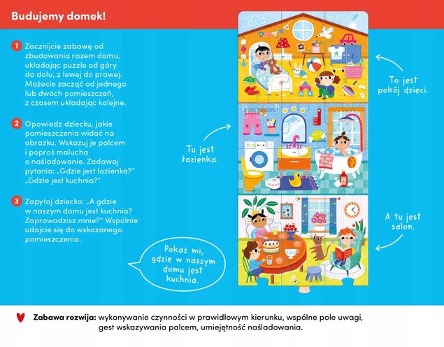 Bajecznie kolorowa i duża układanka składa się z 24 elementów i przedstawia 4 domowe pomieszczenia: pokój dzieci, łazienkę, salon i kuchnię. 32 wybrane przedmioty z każdego pokoju znajdują się na dokładanych kafelkach. Pozwala to na mnóstwo fascynujących i wszechstronnie rozwijających zabaw, a pomysły na nie znajdziecie w poradniku dołączonym do puzzli i elementów. Edukacyjny zestaw doskonały pomysł na prezent dla bystrego malucha i przedszkolaka.