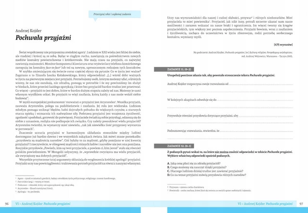 Prezentuje zadania zamknięte i otwarte, ułożone w zestawy zgodne z formułą arkuszy Centralnej Komisji Egzaminacyjnej. Wybranym zadaniom towarzyszy komentarz dotyczący sposobu ich rozwiązywania oraz sprawdzanych umiejętności. W publikacji uwzględnione zostały odpowiedzi do zadań zamkniętych i propozycje rozwiązań zadań otwartych, w tym przykładowe wypracowania.