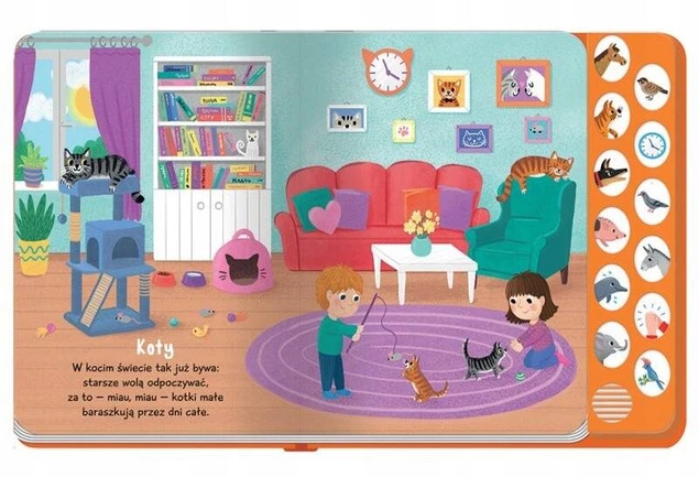 Dodatkową atrakcją są dołączone dźwięki. Posłuchaj, jak brzmią: koń, kot, pies, świnka, delfin, słoń, papuga, osioł oraz inne zwierzęta i przedmioty pokazane w książce. Do czytania, słuchania i oglądania!