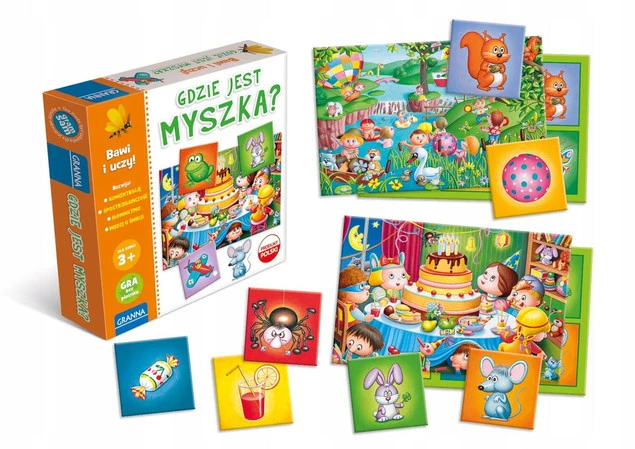Gdzie jest myszka to fantastyczna gra dla dzieci od 3 roku życia, która uczy i bawi. W opakowaniu znajdziemy cztery plansze z obrazkami, dwadzieścia cztery kartoniki oraz instrukcję. Na kartonikach znajdują się obrazki, przedstawiające określone przedmioty lub zwierzęta, które również są ukryte na planszy. Dziecko ma za zadanie odnaleźć na swojej planszy wszystkie ukryte elementy. Gra rozwija spostrzegawczość i koncentrację dziecka, a także poszerza wiedzę o otaczającym świecie oraz rozbudowuje słownictwo. Gra została stworzona z troską o środowisko naturalne i nie zawiera plastikowych elementów.