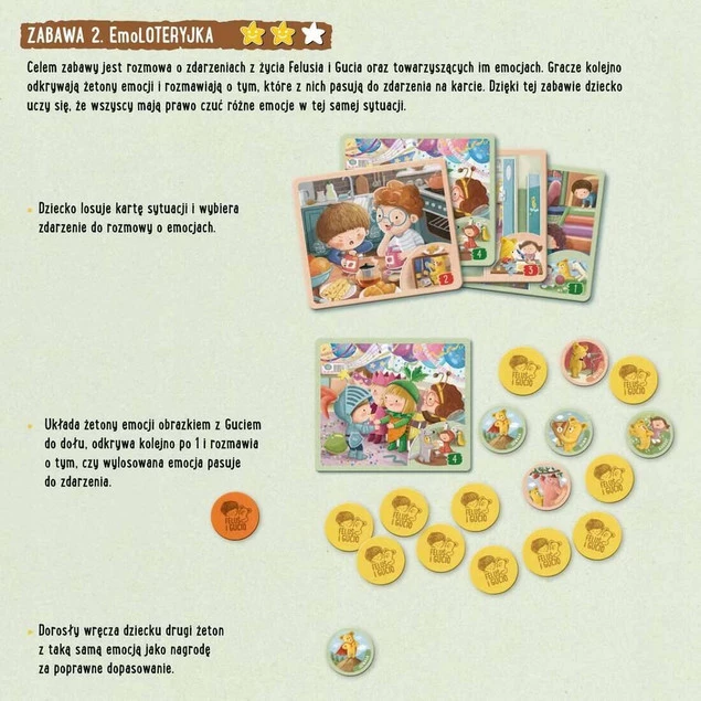 Kolejna gra w serii, ale pierwsza z tak różnorodnym zestawem gier i zabaw! Idealna jako samodzielny pakiet edukacyjny oraz uzupełnienie książki „Feluś i Gucio poznają emocje". Gra wspiera prawidłowy rozwój emocjonalny i wspomaga rodziców w trudnych rozmowach z dzieckiem o emocjach.
