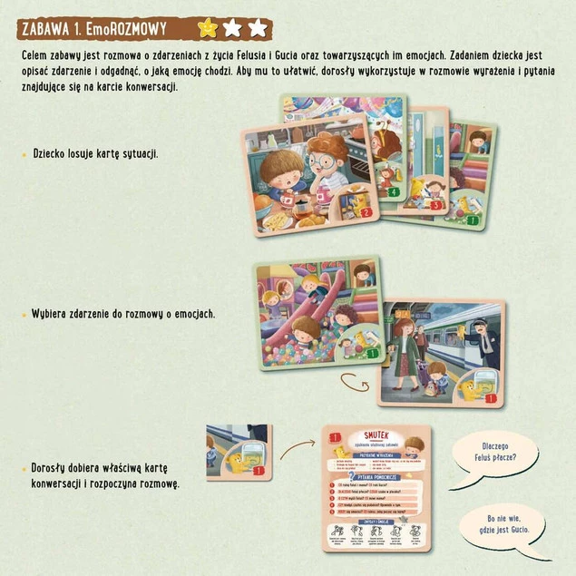 3 podstawowe rodzaje zabaw w tym zestawie to: memo, kalambury i konwersacje. Ten rodzaj aktywności szczególnie sprzyja nauce rozpoznawania, nazywania i wyrażania emocji, będącej głównym celem gry.