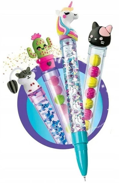 - Bogata paleta akcesoriów: 10 obudów do długopisów, 10 skuwek, 10 zatyczek, 10 końcówek, 12 wkładów atramentowych, proszek brokatowy, 6 torebek z dekoracjami, 40 mini pomponów, 32 plastikowe koraliki, 10 gumowych znaków, ilustrowana instrukcja oraz lejek
