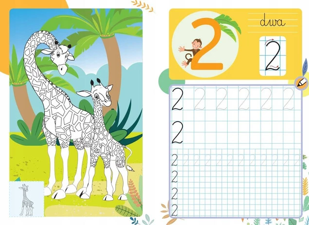 W środku: kolorowanki tematyczne, barwne naklejki, instrukcja pisowni krok po kroku, miejsce na ćwiczenia, proste zadania.
