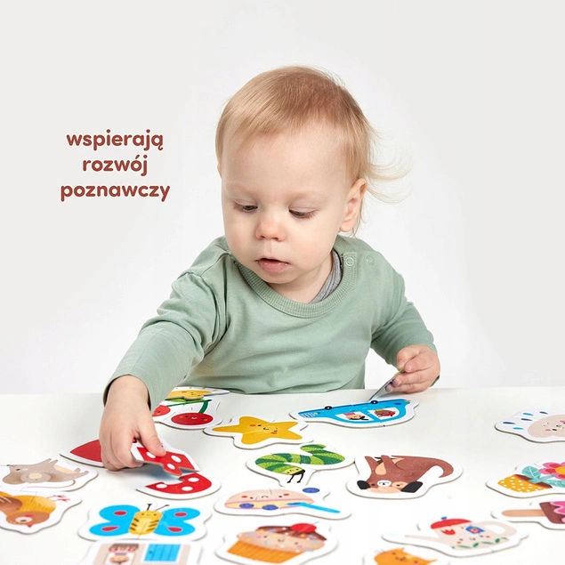 - Ćwiczcie spostrzegawczość, wyszukując pasujące połówki, i sprawność rączek, łącząc je ze sobą. Pomóż maluchowi, jeśli tego potrzebuje. Możecie zacząć zabawę od mniejszej liczby układanek.