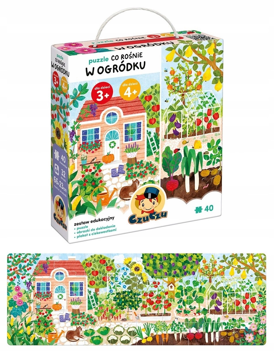 Soczyście kolorowa i duża układanka składa się z 40 elementów i przedstawia kwitnący ogród i sad. 32 owoce i warzywa znajdują się na dodatkowych kafelkach do dokładania. Umożliwia to mnóstwo fascynujących i wszechstronnie rozwijających zabaw, które pozwolą lepiej zrozumieć i zapamiętać, co rośnie w ogródku. Mnóstwo przyrodniczych ciekawostek znajdziecie na plakacie dołączonym do puzzli. Edukacyjny zestaw sprawdzi się jako pomysł na mądry prezent dla ciekawego świata przedszkolaka.