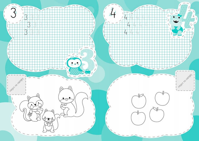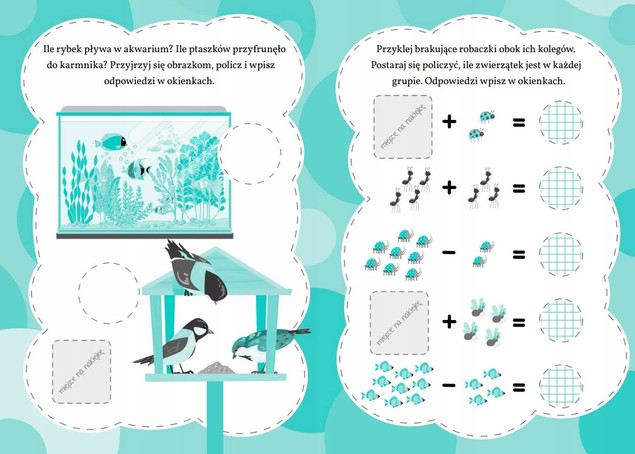 Znajdź i przyklej naklejki. Dobieranie naklejek jest ćwiczeniem na kojarzenie, a odpowiednie wklejanie uczy staranności.
