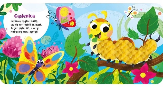 Bohaterami tej książeczki są mieszkańcy łąki: puchaty zajączek, włochata gąsienica, żaba z karbowaną skórą, welurowy kret, motyl z cekinowymi skrzydłami i ślimak ze skorupą ze skaju.