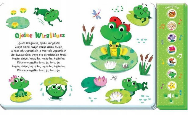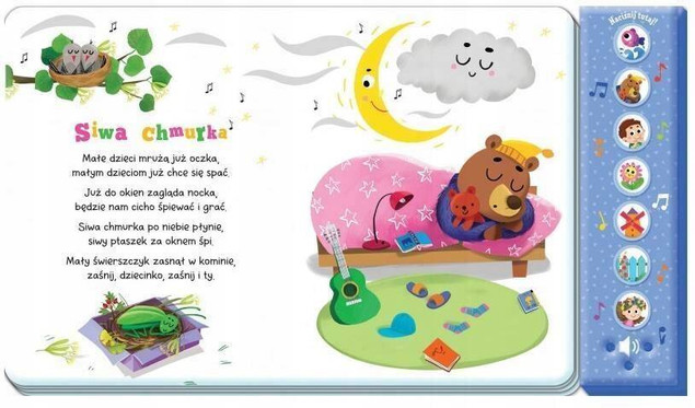 - Wymiary: 20,4 x 20 cm; karton; ilustracje barwne; moduł dźwiękowy z 7 piosenkami