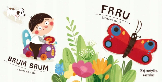 Ta przeznaczona już dla rocznych dzieci interaktywna książka zapoznaje małych czytelników z podstawowymi kolorami i wyrazami dźwiękonaśladowczymi.