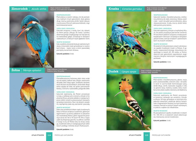 Atlas ptaków przedstawia ponad 250 gatunków ptaków regularnie występujących w Polsce. Podpowiada, jak rozpoznać dany gatunek, jakie są jego cechy i co go wyróżnia. Na końcu książki załączono tabelę wszystkich gatunków ptaków stwierdzonych w Polsce i zaakceptowanych przez Komisję Faunistyczną Polskiego Towarzystwa Zoologicznego.