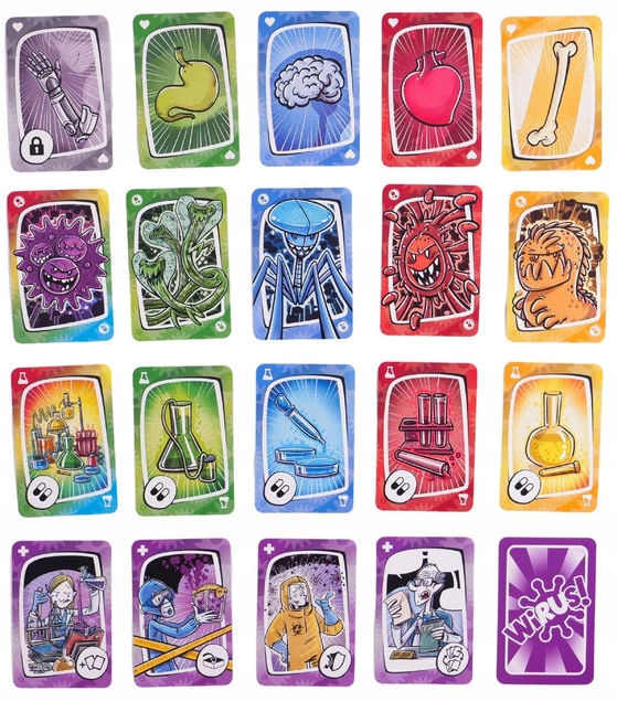 Zestaw dwóch dodatków do gry karcianej Wirus zawiera: