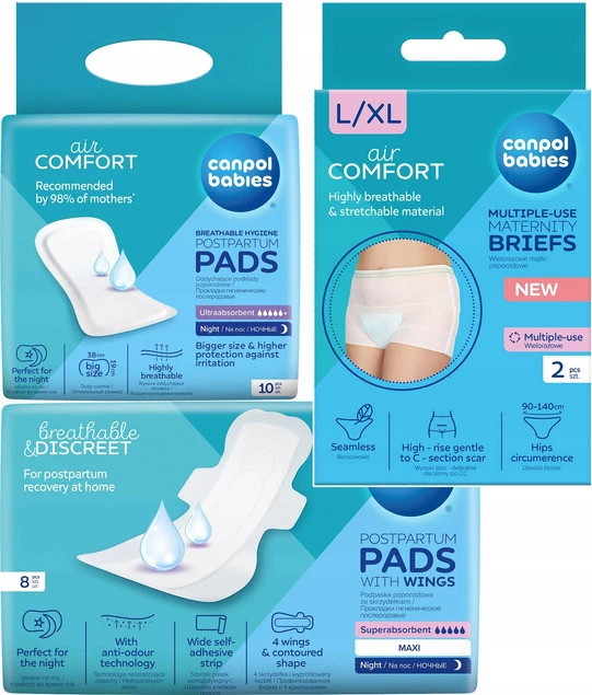 Wyjątkowo oddychająca struktura i wyprofilowany anatomiczny kształt zapewnia komfort użytkowania i skuteczną ochronę przed przeciekaniem. Podkłady poporodowe Canpol babies są niezbędne, zarówno po porodzie fizjologicznym, jak i poprzez cesarskie cięcie ze względu na obfite krwawienia w pierwszych dniach po porodzie oraz potrzebę wietrzenia krocza.