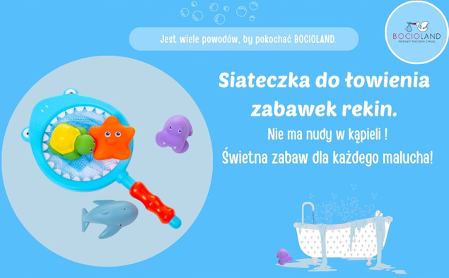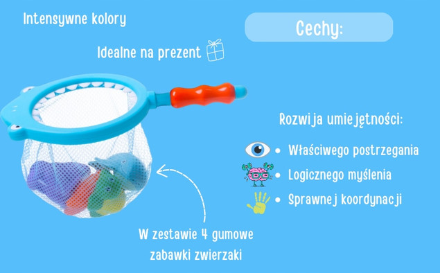 Ponadto jeżeli twoja pociecha boi się wody i nie lubi kąpieli - barwne rybki i rekin z pewnością ułatwią oswajanie się z wodą w formie zabawy. Rozrzuć rybki w wannie lub basenie i przy pomocy rekina z siateczką, pozwól dziecku wyłapać je z wody.