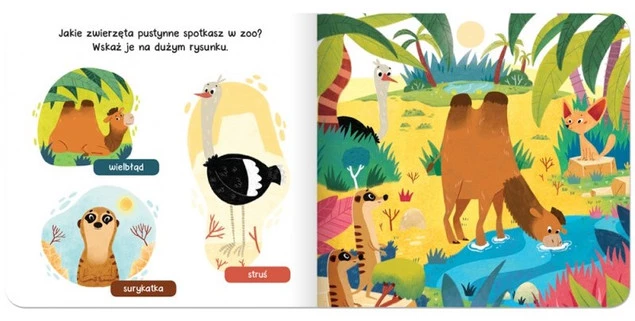 • Kartonowa książeczka „Raz, dwa, trzy… Szukam! W zoo” dla dzieci 0–3 lata. Duże ilustracje, zwierzęta z zoo, twarda oprawa – idealna pierwsza książka dla malucha.