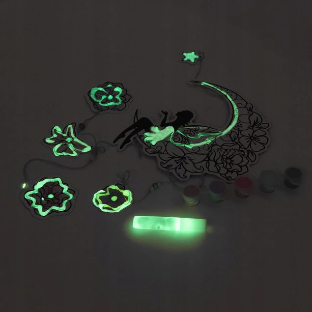 W opakowaniu znajduje się 9 koralików, 6 diamencików, 6 tekturowych kształtów, 5 kolorów farb oraz pędzelek, klej świecący i sznurek, którym złączysz całość elementów.