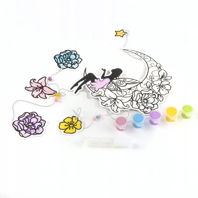 Zaprojektuj swój magiczny łapacz z tekturowym szablonem wróżki siedzącej na księżycu otoczonej bajkowymi kwiatami, który pięknie udekoruje pokój.