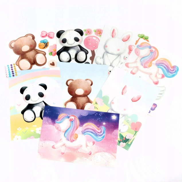Do dyspozycji są 4 arkusze z nalepkami do przyklejenia do podkładów pod stylizacje ze wzorami: jednorożca, misia, pandy i króliczka.