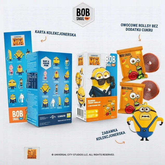 - Ekskluzywne breloki. W kolekcji Bob Snail Fun Minions znajduje się 12 breloków z bohaterami filmu animowanego "Gru i Minionki: Pod przykrywką" z licencją od Universal Studios.