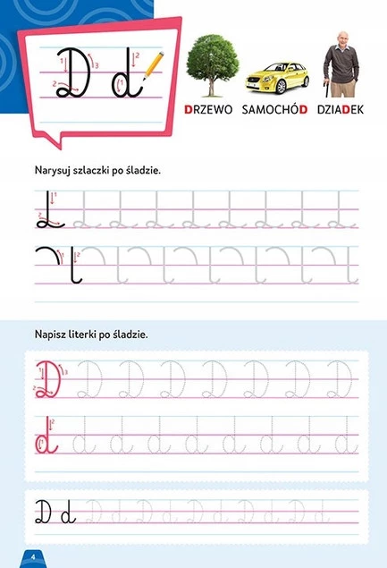 Każda strona poświęcona jest jednej literce. Ćwiczenia rozpoczynają się od szlaczków, które pomyślane są w ten sposób, by rzeczywiście odwzorowywały jakiś fragment literki i przygotowywały rączkę do jej pisania - gwarantuje to, że korzystanie z nich jest przydatne. Następnie dziecko może poćwiczyć pisanie konkretnej literki - najpierw większej, a potem wielkości takiej, jak w szkolnych zeszytach. Strzałki we wzorze literki pokazują, jak należy poprawnie prowadzić długopis. Dodatkowo na każdej stronie dziecko znajdzie przykład występowania danej literki w słowach - na początku, na końcu i w środku, wraz z estetycznymi ilustracjami. Książeczka jest czytelna, przyjemna dla oka i zachęcająca malucha do ćwiczeń.