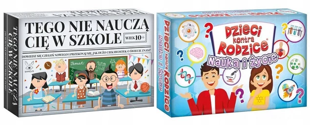 Zestaw 2w1 "TEGO NIE NAUCZĄ CIĘ W SZKOLE + DZIECI KONTRA RODZICE" od Kangur to doskonała propozycja dla rodzin poszukujących inspirujących gier edukacyjnych. "TEGO NIE NAUCZĄ CIĘ W SZKOLE" wprowadza graczy w nietypowe zagadnienia i umiejętności życiowe, podczas gdy "DZIECI KONTRA RODZICE" angażuje w zabawne wyzwania, które testują wiedzę i spostrzegawczość. Ten zestaw oferuje nie tylko rozrywkę, ale także możliwość wspólnej nauki i odkrywania nowych tematów w radosnej atmosferze, łącząc pokolenia w zdrowej rywalizacji i nauce.