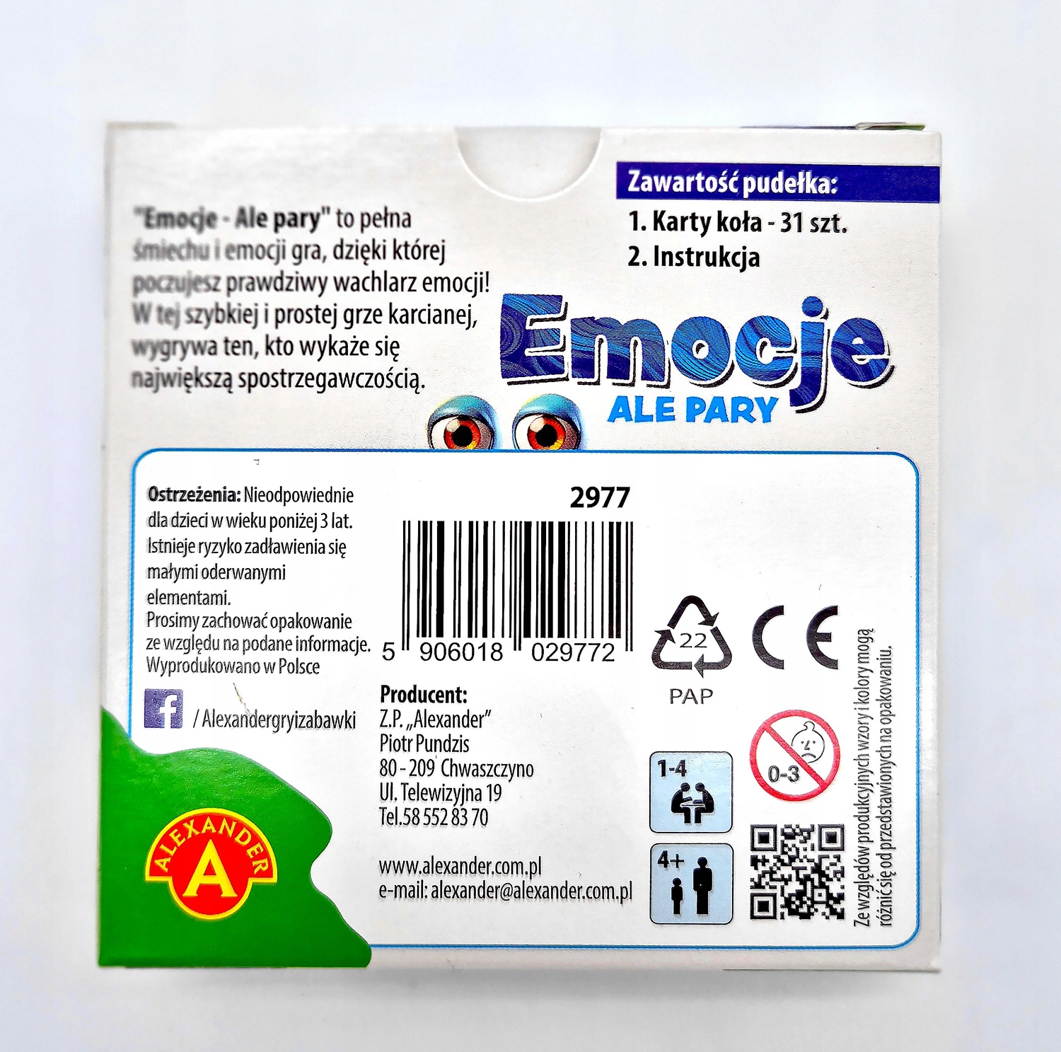 ![]() | Ale Pary - EmocjeOdkryj świat emocji poprzez zabawę!„Ale Pary - Emocje” to wyjątkowa gra, która poprzez zabawę, może pomóc dzieciom zrozumieć, co czują i pokazać, jak radzić sobie z różnymi emocjami. Gra polega na znalezieniu wspólnego obrazka – przedstawiającego emocję – na dwóch kartach. Ale uwaga! Emocje mogą różnić się wielkością, co sprawia, że wyzwanie jest jeszcze większe. Gra toczy się w dynamicznym tempie, więc potrzebna jest koncentracja i szybka reakcja. |