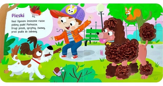 „Dotknij i poczuj” to doskonała seria dla maluszków. Na każdej stronie rysunek jednego zwierzaka wzbogacony jest o miły w dotyku materiał: plusz, futerko, cekiny lub skaj. Ilustracje z pewnością spodobają się dzieciom, bo oprócz bohatera na rysunku jest wiele innych zwierzątek. Bohaterami tej książeczki są domowi pupile: puchaty króli, żółw ze skorupą ze skaju, puchaty chomik, rybka z cekinową łuską, piesek ze sznurkową sierścią. Dotykanie dołączonych elementów pozytywnie wpływa na rozwój dziecka. Barwne i odpowiednie dla najmłodszych ilustracje, ciekawa tematyka oraz zabawne wierszyki o bohaterach książeczki połączone z zabawą w dotykanie puchatych elementów to wspaniała zabawa na długie godziny. Książeczki sensoryczne to doskonały sposób na stymulowania zmysłów malucha.
