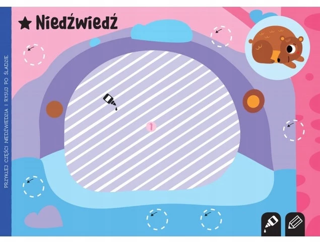 Jak z niej korzystać? Dziecko wycina proste elementy i przykleja w odpowiedniej kolejności tak, by powstał obrazek, a całość kompozycji dopełnia, rysując po linii przerywanej. Perforacja w książce ułatwia wyrywanie kart i wycinanie.