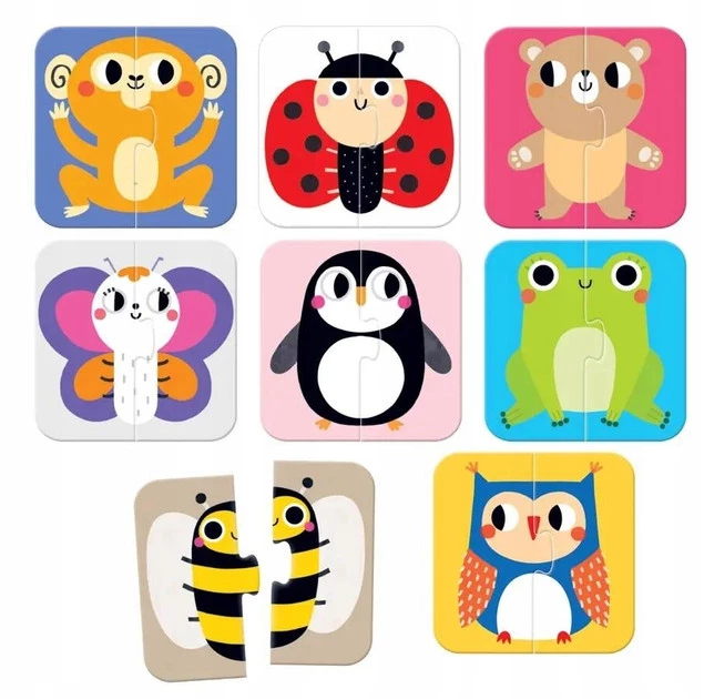 Co to za zwierzątka? Połączcie połówki i przekonajcie się sami! Dwuelementowe układanki doskonale sprawdzą się jako pierwsze puzzle dla maluszków.