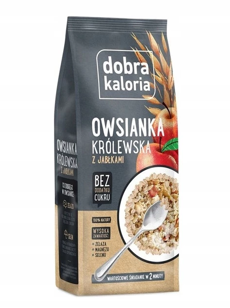 Owsianka królewska z jabłkami bez dodatku cukru (zawiera naturalnie występujące cukry). Owsianka jest bogatym źródłem: białka o wysokiej wartości biologicznej, żelaza, magnezu, wapnia, nienasyconych kwasów tłuszczowych, błonnika.