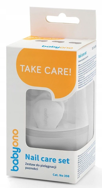 Kompletny zestaw do pielęgnacji paznokci niemowląt. Higieniczne, wykonane ze stali nożyczki (stal nierdzewna) i cążki (stal chromowana) do obcinania paznokci oraz szklany pilniczek do wygładzania nierówności.