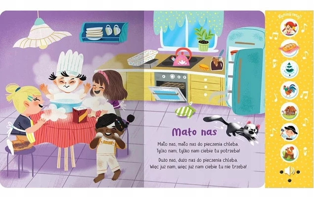 Słuchaj i śpiewaj razem z nami! W książce znajduje się siedem lubianych i popularnych piosenek przekazywanych z pokolenia na pokolenie. Kolorowe ilustracje oraz teksty każdej z piosenek zachęcą dziecko do wspólnego śpiewania. Teksty otoczone są kolorowymi ilustracjami, nawiązującymi do treści piosenek, często je uzupełniają, a co najważniejsze – zachęcają do wspólnej zabawy. Piosenkę można włączyć, naciskając kółeczko z obrazkiem po prawej stronie książki. Jedno kółeczko odpowiada jednej piosence. W każdej chwili można wyłączyć grającą melodię, ponownie naciskając kółeczko. Książka działa na baterie, które można wyjąć i wymienić. Istnieje również możliwość wyłączenia grających piosenek, przesuwając guzik przy baterii. Książka sprawdzi się dla dzieci w każdym wieku. Młodsze mogą tylko słuchać piosenek, starsze dzieci mogą przeczytać tekst i śpiewać równocześnie z nagraniem.