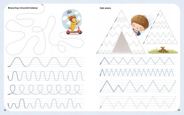 Zabawa i nauka w jednym! Kreatywny zeszyt dla starszaków, który ćwiczy gotowość do nauki pisania. Zeszyt zawiera rozgrzewkę rozwijającą motorykę małą i dużą oraz ćwiczenia wspierające pracę rąk.