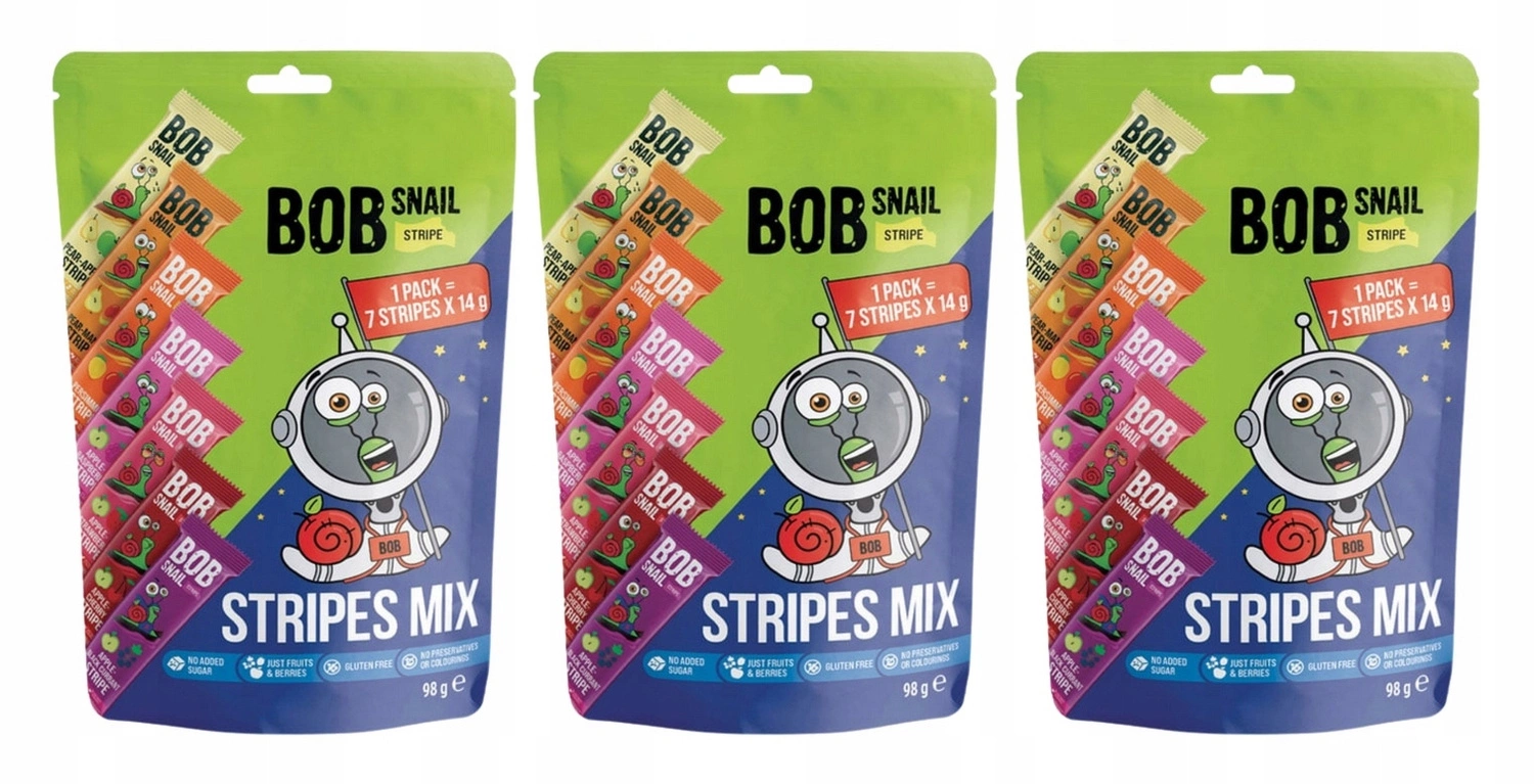 3x BOB SNAIL Pasek 7 Smaków x 14g OWOCOWE PRZEKĄSKI MIX Pasków 100% Owoce