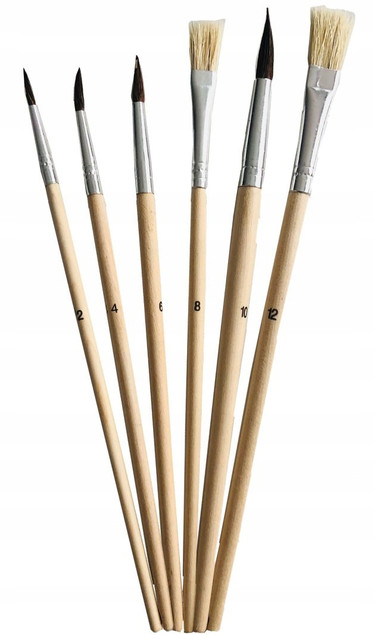 - Uniwersalny zestaw 6 pędzelków – w różnych rozmiarach: 2, 4, 6, 8, 10 i 12, co pozwala na precyzyjne dopasowanie do rodzaju pracy.