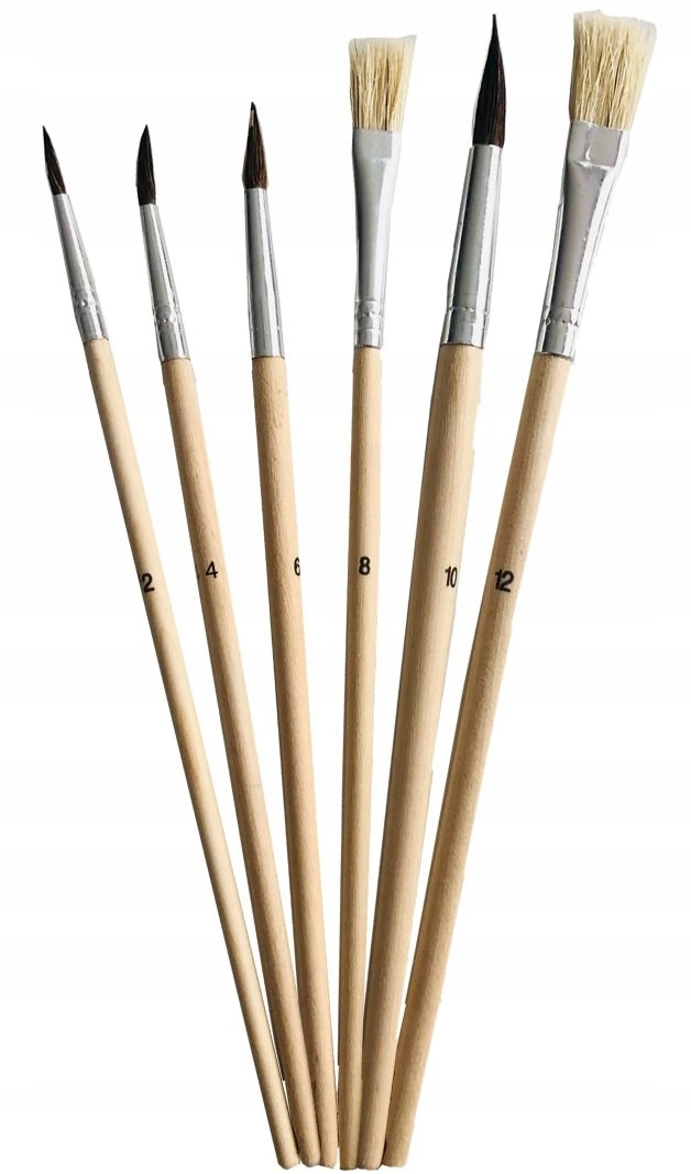 - Uniwersalny zestaw 6 pędzelków – w różnych rozmiarach: 2, 4, 6, 8, 10 i 12, co pozwala na precyzyjne dopasowanie do rodzaju pracy.