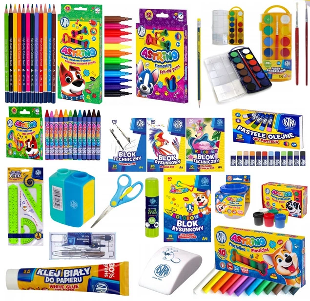 Bardzo duży, kompletny zestaw podstawowych artykułów plastycznych opierający się na produktach Astra w wersji dla klas 1-3 ze zwierzątkami Astrino. Jest doskonałym rozwiązaniem przy kompletowaniu wyprawki szkolnej dla dziecka.