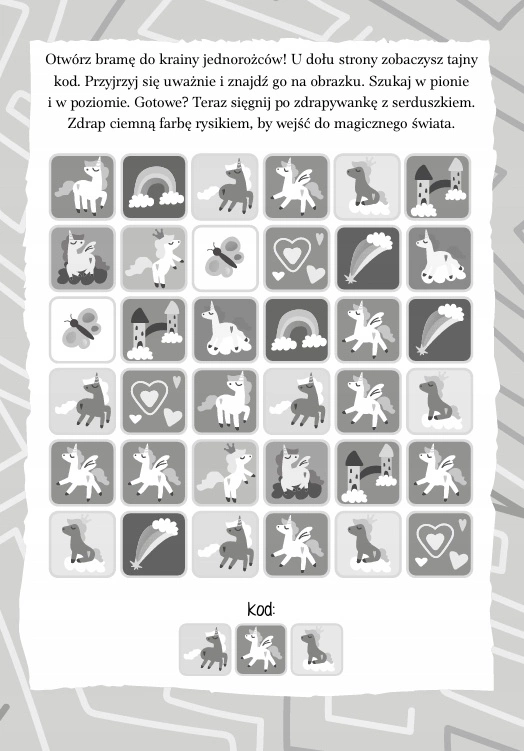 - 6 kart zdrapek, a na nich: ukryte obrazki oraz pole do wydrapania wskazanych kształtów