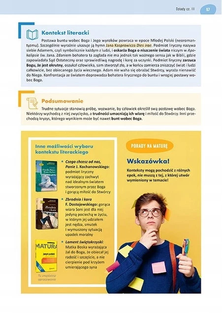 To nie wszystko - nasze repetytorium zawiera wiele innych, bardzo przydatnych dla ucznia materiałów. Znajdują się tu omówienia motywów literackich, a także krótki, lecz wypełniony treścią poradnik, jak sformułować dobrą wypowiedź ustną. Książka ma przejrzystą i nowoczesną szatę graficzną, która ułatwia korzystanie z niej i naukę.